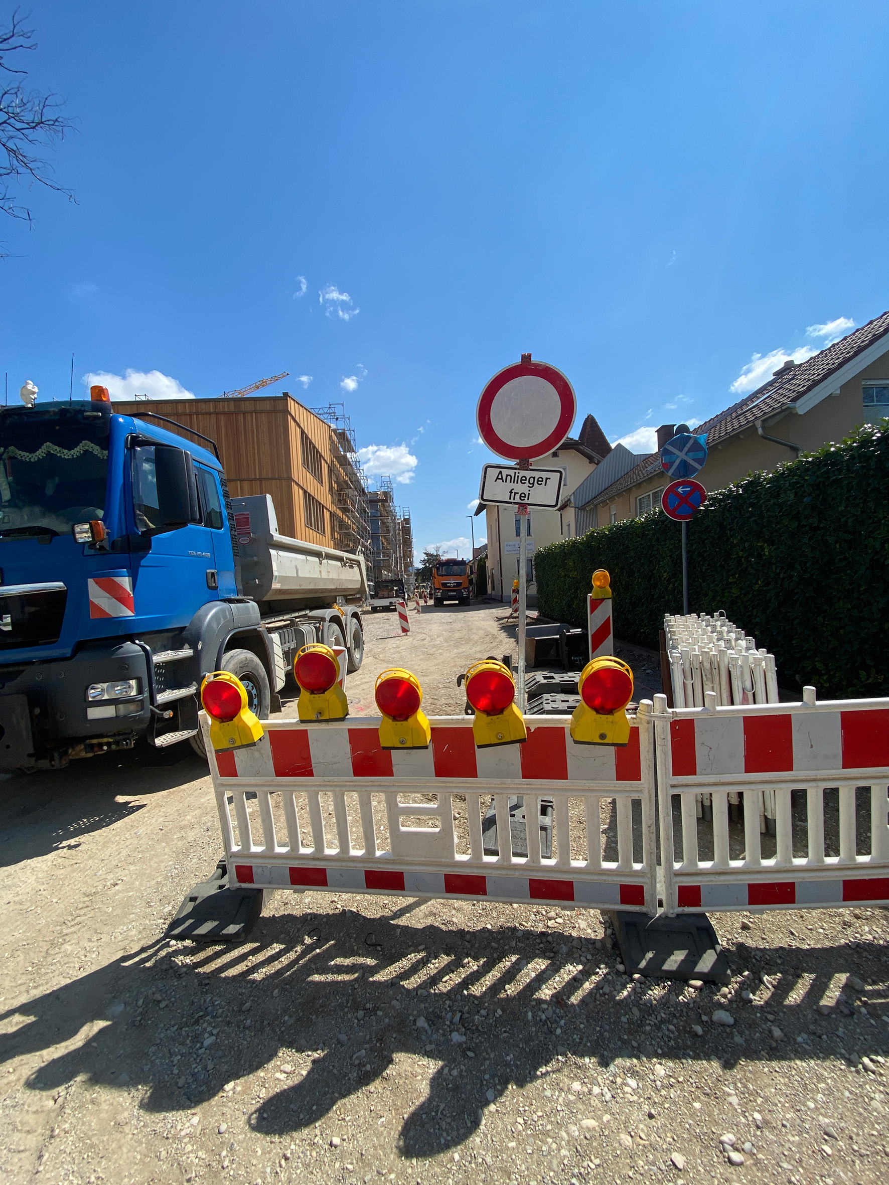 Die Freilassinger Stadtwerke haben am Birkenweg die Hauptwasserleitung neu verlegt und die Wasserhausanschlüsse der Anlieger ausgetauscht. Um zu den Leitungen in der Erde zu gelangen, musste die Straßenschicht ausgebaut werden. Zu Ostern waren die Wasserleitungsarbeiten abgeschlossen. Danach begann der Straßenbau. Die Arbeiter setzen seitdem Leistensteine, pflastern und asphaltieren den Birkenweg. Voraussichtlich ist die Straße nach den Pfingstferien weitgehend fertig gestellt und der Birkenweg dann wieder für alle, insbesondere auch für die Schüler, begehbar.